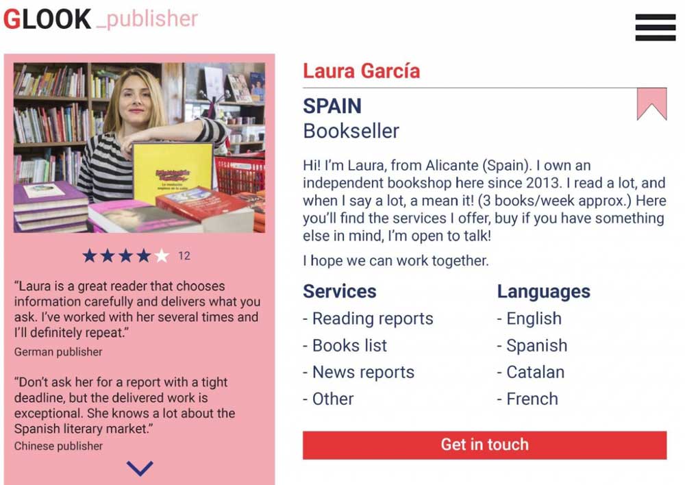 Con el fin de hacer más accesible esta información y democratizar el conocimiento sobre actualidad y tendencias literarias a nivel mundial entre los editores independientes y pequeños sellos editoriales, mi proyecto plantea crear una plataforma online o red social (Glook) donde traductores, correctores, críticos, periodistas, estudiantes de literatura o edición, aficionados a la lectura se convertirían en scouts ocasionales y proporcionan a los editores información sobre noticias, listados de libros más vendidos, insights e informes literarios por encargo.