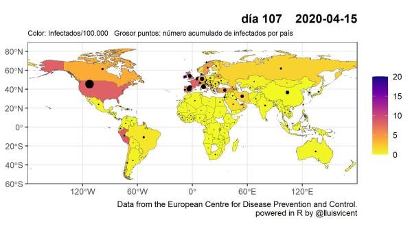 Esta visualización, de una manera muy intuitiva, da una información óptima sobre qué zonas del planeta están experimentando un crecimiento más acusado de la pandemia en cada momento.