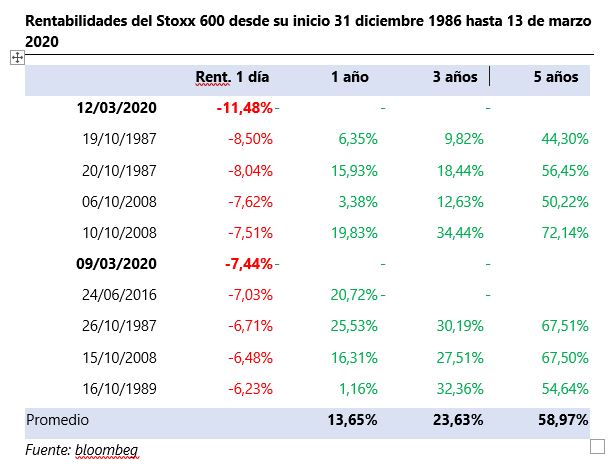 En el siguiente cuadro podemos ver que ha ocurrido justo 1 año, 3 años y 5 años después de los peores días en bolsa europea.