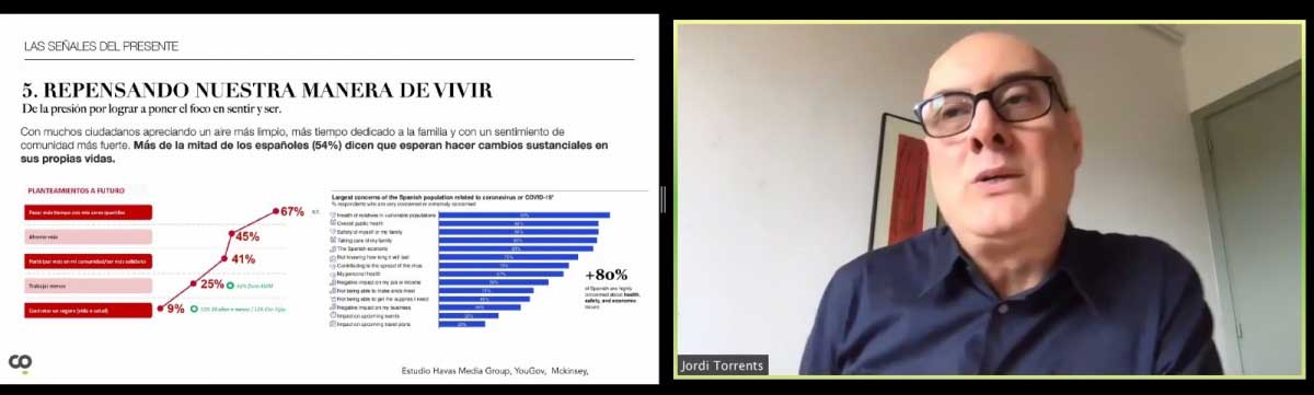 Torrents, experto en analizar tendencias y diseñar el posicionamiento de grandes marcas, presentó un estudio elaborado por Collaborabrands a partir de más de 100 informes publicados sobre el COVID y su impacto en el consumo y las marcas. La metodología utilizada –explicó- es el Future Thinking (disciplina que usa el futuro para transformar el presente). 'No se trata de predecir, sino de construir un nuevo futuro en base a las señales que nos muestra el presente'.