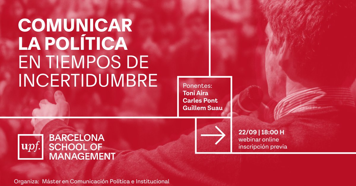 El pasado martes 22 de septiembre, el director del Máster en Comunicación Política e Institucional, Carles Pont Sorribes, y el coordinador académico, Guillem Suau Gomila, realizaron el webinar 'Comunicar la política en tiempos de incertidumbre'. En esta sesión, desde la perspectiva de la comunicación de crisis y emergencias, se reflexionó sobre la comunicación política e institucional que se ha llevado a cabo en diferentes contextos durante la crisis sanitaria de la Covid-19.